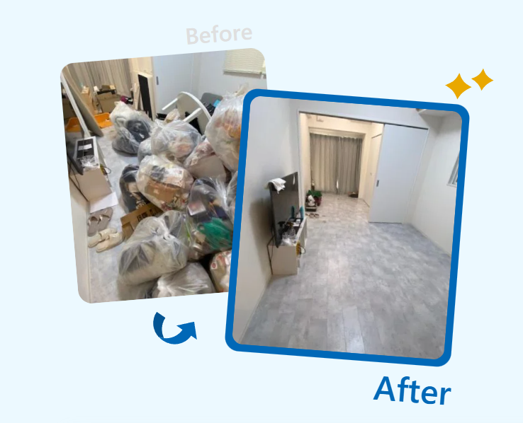 空き缶や弁当のゴミが床に散乱している状況でしたが、すべてを袋に入れて回収させていただきました。長年お悩みだったとのことで、思い切ってお電話をいただき、「人柄が安心できたから」と選んでいただけたことに、スタッフ一同心から嬉しく思いました。不用品回収ポケット大阪では、どのような片付けにも対応しておりますので、ぜひお気軽にご相談ください。