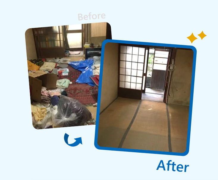 引越しの期間が迫っており、お困りだったお客さまからご依頼をいただきました。CDデッキや洋服、瓶や座椅子などの不用品があり、思い切ってすべての荷物を処分してくださいという事で一部屋を空っぽにさせていただきました。