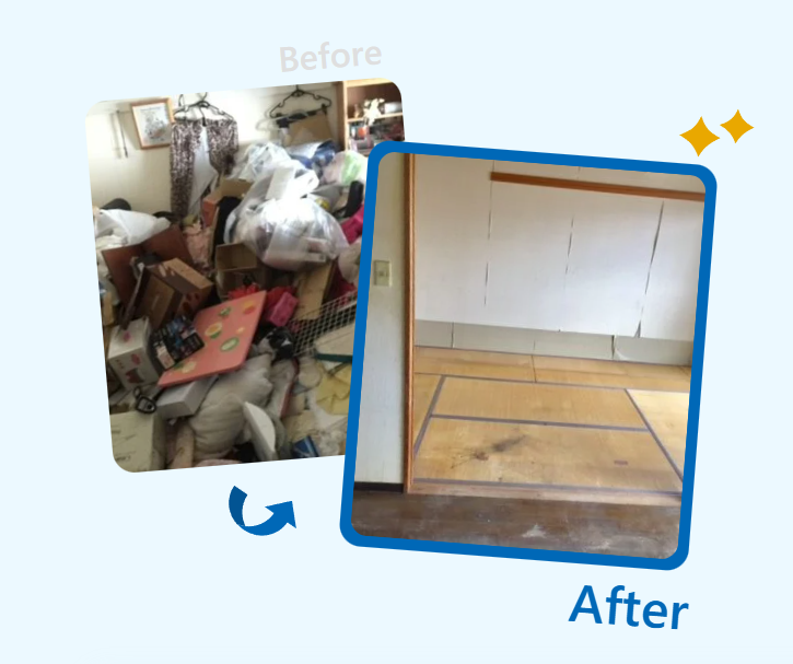 引きこもりの影響で、足の踏み場もないゴミ屋敷と化したお宅をきれいにしてほしいとのご依頼をいただきました。家電や衣類が散乱している状態でしたが、依頼者様に見守られながら、部屋を整頓しました。約1時間30分で不要品の回収と臭いの除去を行い、入居時の美しい状態に戻すことができました。2階から階段で下ろせない大きなベッドや折りたたみテーブルは、2名のスタッフがベランダから下ろしました。ゴミ置き場と化していた一室がきれいになり、生活スペースとして利用できる状態に整いました。ご希望通りに回収を行い、作業のスピードやサービスにご満足いただけたようです。