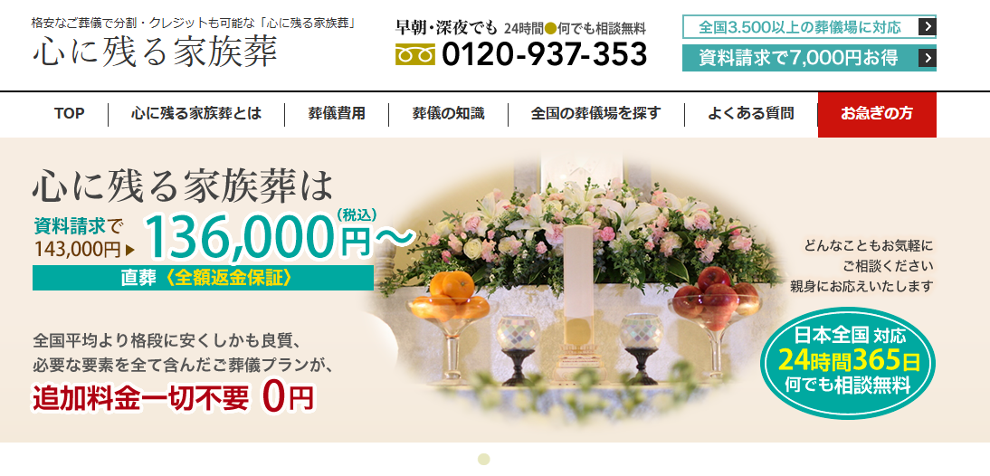 「心に残る家族葬」では追加費用0円の格安葬儀・家族葬を全国で24時間365日対応しております。