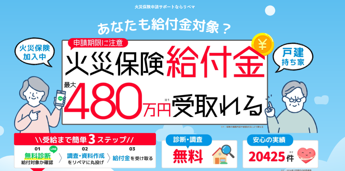 スマホから簡単に火災保険の給付金を受け取ることができるかを調査することができるリペマ。20425件の実績があり、査定や調査も無料で行ってくれます。