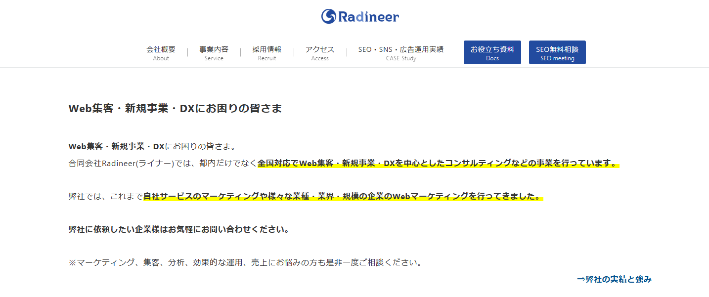 SEOコンサルティング、SNSマーケティング支援、生成AI活用支援など、少数精鋭のスタッフによる的確な施策を提供し、