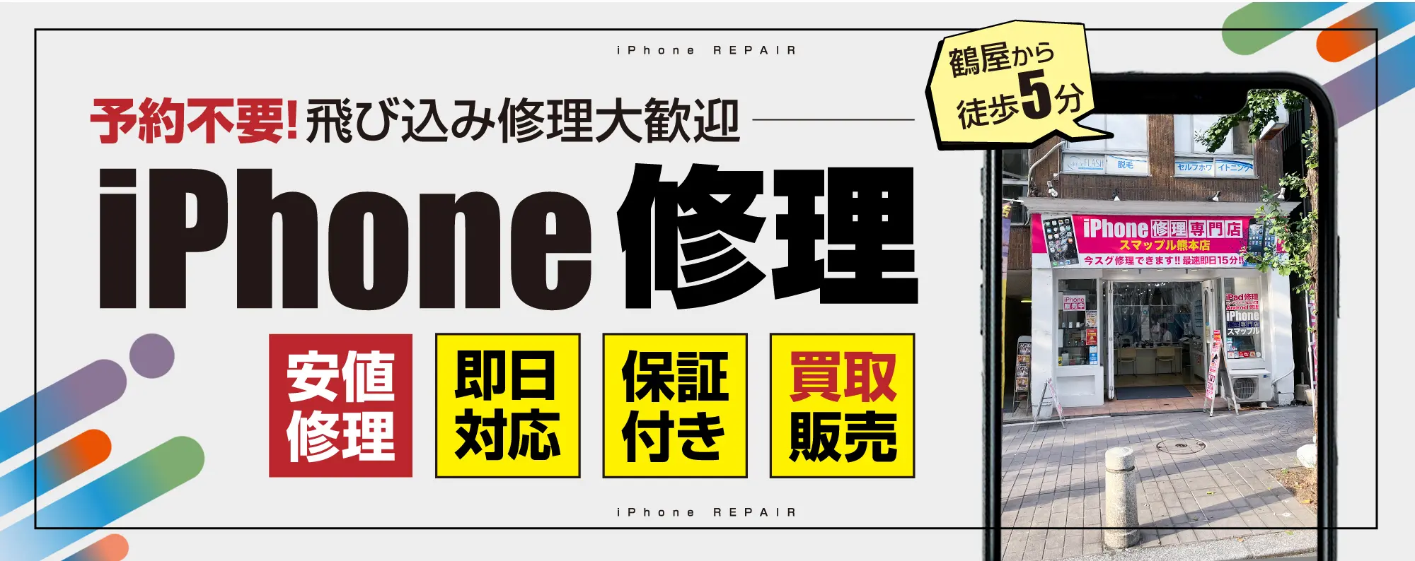 iPhone修理熊本なら熊本市中央区にあるスマップル熊本店【総務省登録修理業者】。住所:熊本県熊本市中央区下通1丁目8−20 下通センタービル 1F 電話番号:096-273-6442
