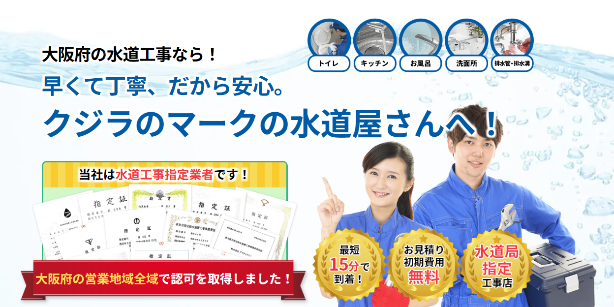 「クジラのマークの水道屋さん 大阪府」は、水道局指定工事店として府内全域に迅速対応。最短15分で駆け付け、見積・出張費無料。トイレ・キッチン・浴室など幅広い水まわりトラブルに対応し、10年保証で安心のサービスを提供します。」