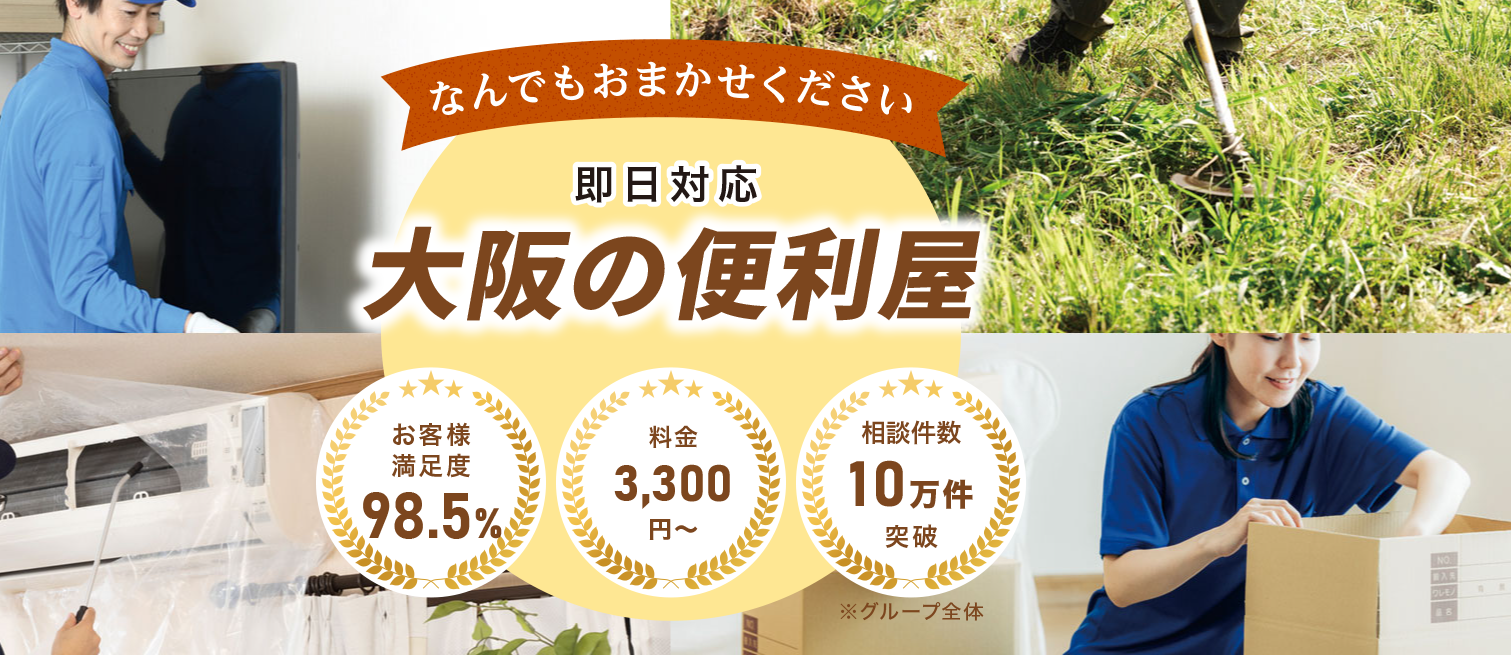 大阪の便利屋王子は暮らしのお困りごとをなんでも解決いたします。大阪府の全域に対応し、不用品回収や引越し、草刈りや家具移動などのお悩みを町の便利屋が解決いたします。お見積り無料!